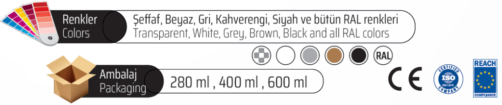 A single-component, neutrally cured, high-performance sealing and filler material. It is used in aluminum and glass exterior façades thanks to its resistance to sun rays and has high adhesion power. It provides excellent adhesion to any porous and non-porous surface without any primer. It does not cause corrosion. It is extremely resistant to any weather conditions. It does not lose its properties at high and low temperatures. (-60 oc/+180 oc). It has a very wide application temperature range. It is solvent-free and 100% silicone. When curing, it emits very little odor. It is used in filling and sealing applications in many materials, such as wall, brick, concrete, PVC, aluminum, wood, glass, etc.